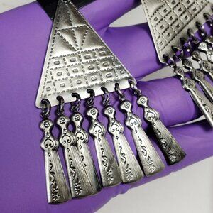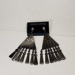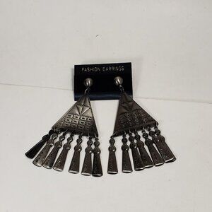 Elevate your style with these women's stylish triangle design drop charms statement earrings. With a post drop dangle design, these earrings exude contemporary elegance and are perfect for making a bold fashion statement. The 3.5-inch drop length adds a touch of sophistication and creates a graceful silhouette. The triangle design charms are eye-catching and add a modern edge to any outfit. Whether you're attending a special event or want to add a fashionable touch to your everyday look, these earrings are sure to impress. Embrace your unique style and showcase your fashion-forward personality with these stunning statement earrings.NWT