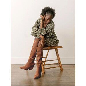 Womens Suede Brown Side Zipper Knee High Pointed Toe Chunky Heel Tall Boots