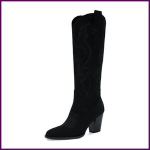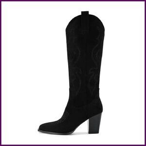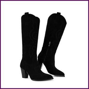 Women's Suede Embroidered Knee High Cowboy Boots Chunky Heel Pull On