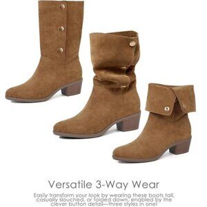 Women's Suede Mid Calf Boots 3 Way Fold Over Style Chunky Block Heel Booties