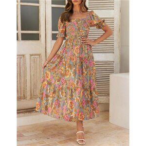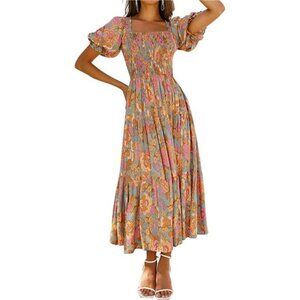 - Women Boho Maxi Dress, Fashionable Elastic Square Neck Design with Special Floral Print, A Line Dress with Cute Puff Short Sleeve