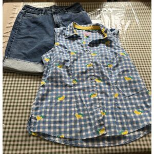 Nice pair of jean shorts size 8 and a sleeveless Laura Scott top size Med. Petite, blue checked with lemons, really cute. All Sales Final. No Returns.