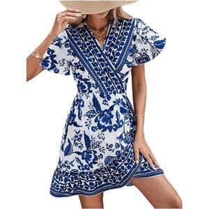 Women's Summer Casual Boho Floral Print Short Sleeve Wrap V Neck Ruffle Dress