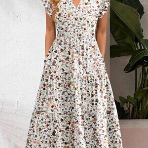 Womens Summer Casual Dresses Ruffle Sleeve V Neck Midi Dress Flowy Tiered Dress