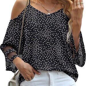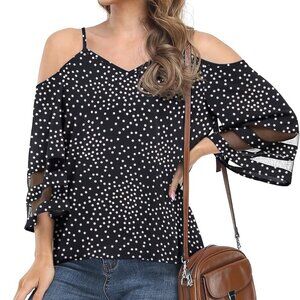 Womens Summer Cold Shoulder Mesh Panel Top - Black Dot - X-large