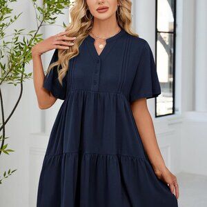 Features: This flowy mini dress features a flattering V-neck with front button closure, short sleeves, and an easy, loose fit that keeps you comfortable all day. The side pleats add a charming touch, and the pockets are super handy for your small essentials. Perfect for a relaxed beach day or casual outing.