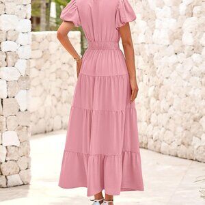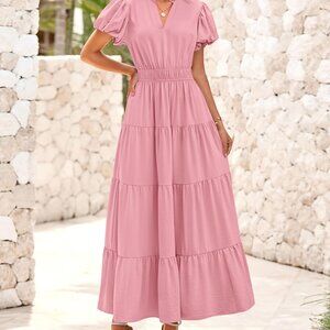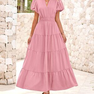 Womens Summer Dresses 2025 Casual Puff Sleeve V Neck Smocked Waist A-Line Tiered