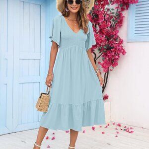 Women's Summer Empire Waist Dress Smocked Flutter Short Sleeve V Neck Midi Dress