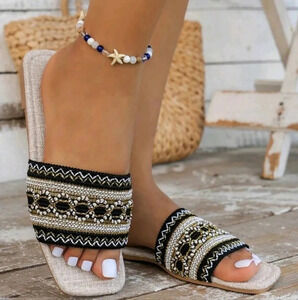 Women's Summer Flat Sandals, Black Embroidery Style Slippers For Party & Beach