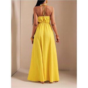 Features: Gorgeous halter-style maxi dress with a backless design, tie back closure, sleeveless cut, and a playful split hem. The swingy, flowy silhouette makes it perfect for warm weather and effortless style. Lightweight, soft, and comfortable — ideal for staying cool and chic.