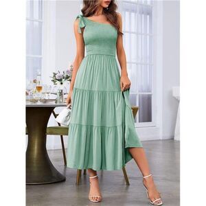 Women's Summer Smocked Midi Dress with One Shoulder and Split Tiered Flowy
