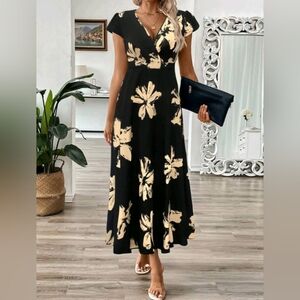 Women's Summer V-Neck Long Leaf Floral Print A-Line Waist Fit Dress