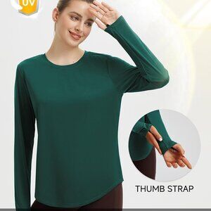 Product details Fabric type 100% Polyester Closure type Pull On Neck style Crew Neck Sleeve type Long Sleeve About this item Sun Protection Stay protected from harmful UVA/UVB rays, making these running shirts ideal for outdoor workouts under the sun. Lightweight, Breathable & Quick-Drying Ultra-light and breathable, these long sleeve workout tops wick moisture fast, keeping you cool and dry through intense activities. Flattering High-Low Hem with Side Slits Designed with a high-low hem and side slits for extra hip coverage and freedom of movement. Reflective Details & Thumbho