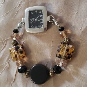 Womens Swap Watch ~Silver Tone Case~Beige & Black Crystal Band.