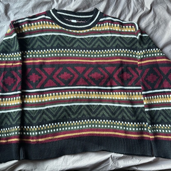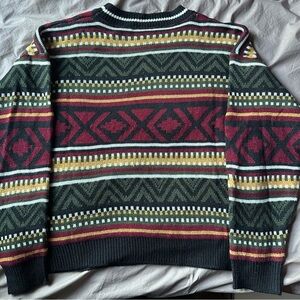 Stay stylish and warm with this multicolor patterned sweater. Featuring a blend of red, green, and yellow hues, this sweater is perfect for any casual outing.