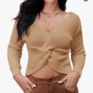 ZAFUL Women's Cold Shoulder Sweater Twist Knot Backless V Neck Knit Pullover Crop Top.