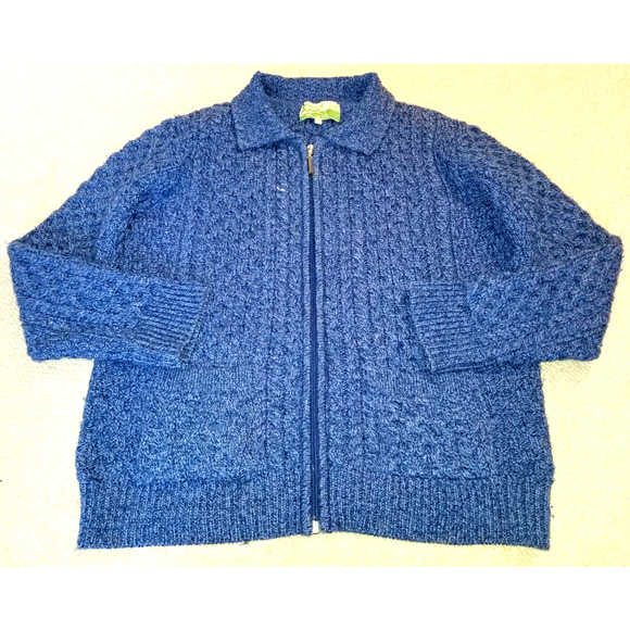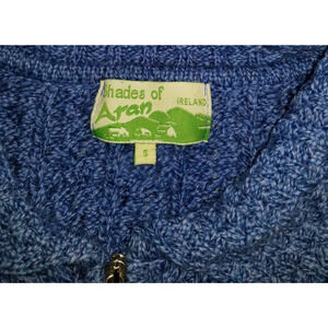Women's Sweater-SHADES OF ARAN-IRELAND-Lovely women's blue cable-knit 100% merino wool zip cardigan sweater. Sweater has a rounded neckline with a collar, full front zipper closures, two front pockets, long sleeves, and is not lined. 100% Merino Wool. Marked Size: S (Underarm-to-Underarm= 20 1/2 inches, Length= 25 inches). Excellent condition. Non-smoking home. Thanks for looking.