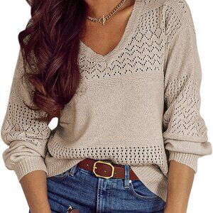 Women's Sweaters Casual Long Sleeve V Neck Lightweight Crochet Pullover Sweater