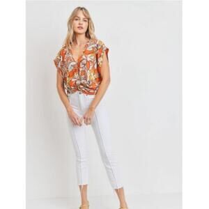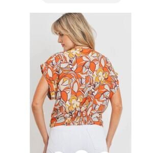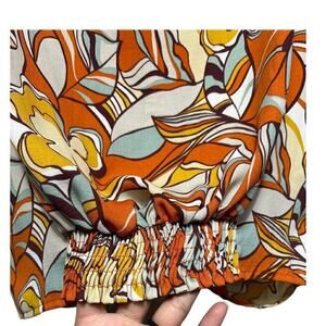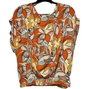 Women’s Sweet Rain Front Twist Multi Abstract Blouse / Size-XL / Color-Orange With Multi Colors / Pre-Owned / V-Neckline,Twisted Front,Cuffed Short Sleeve