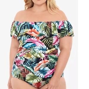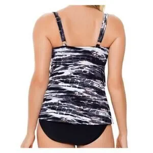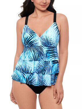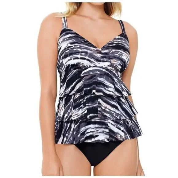 Features tiered overlay, moderate bottom coverage, tummy control, hip minimizer, breast support with non removable cups, and adjustable shoulder straps.