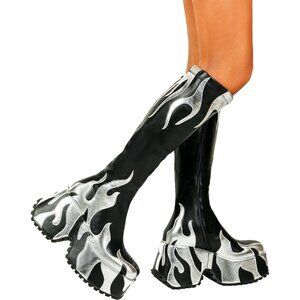 Faux Leather uppers, linings and insole are made of Faux leather , Deep-toothed Huge anti slip teeth rubber sole .platforms with high heels shows your tall legs and perfect figure,All these are on our thick wedge-shaped soles with shark tooth grip at the bottom.silver flames printing make it a bit more fashionable and sexy.