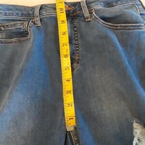 These trendy jeans feature a flattering high-rise fit and stylish distressed details for an edgy look. Perfect for adding a touch of rebellious flair to any outfit. In gently worn condition and ready to wear!