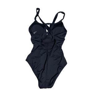 La Blanca women’s one-piece swimsuit in black, size 6 (medium equivalent). New without tags and sanitary liner still attached. Model LB11IG27. Elegant ruching through the waist and bust with a subtle front keyhole cutout. A flattering silhouette for beach, pool, hot tub, or vacation wear. Fully lined with adjustable straps.