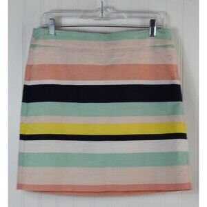 This product is a women's size 8 multicolor striped short straight pencil skirt from LOFT. Made of a cotton blend material, it features a zip closure, is machine washable, and has a regular fit. The skirt is designed for summer and spring occasions, such as parties, casual outings, or business meetings. With a lined and stretchy construction, this trendy skirt is perfect for women looking for a stylish and versatile addition to their wardrobe.
