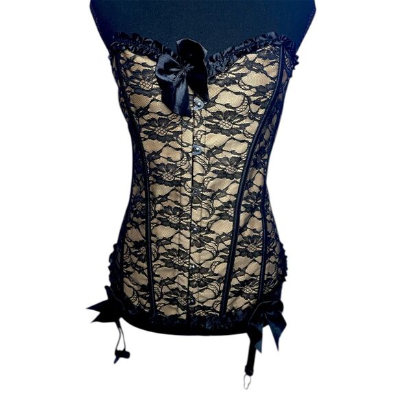 Womens Sz L Lace Corset Bow Ren Faire Valentines Lingerie Sexy Ruffle Boudoir