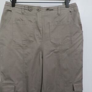 Womens tan cargo style pants. Pull on pants with front pockets and patch pockets. Cargo pockets on sides. Wide leg pants.