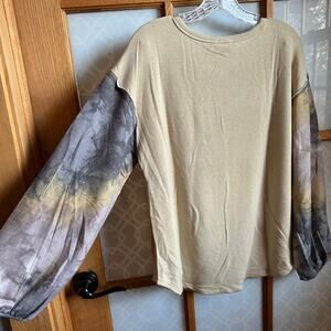 Top; is a boat neck with long balloon sleeve & elastic cuff. Manufacture’s raw seam where bodice and sleeve meet.