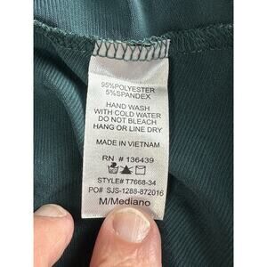 This Women's Sz M Green Long Sleeve Blouse with Gold Studded Embellishments is a stylish and versatile top perfect for the holiday season. The geometric pattern, round neckline, and classic 3/4 sleeves give it a retro, feminine vibe. Made from a comfortable spandex and polyester blend knit fabric, this blouse features a pullover closure and a hand wash only care instruction. The elegant gold studded accents add a touch of luxury, making it a standout piece for casual occasions in the winter and fall seasons.