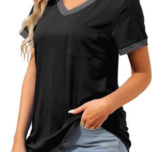 Features: Casual V Neck T Shirts with Pocket, Solid Color/Patchwork Sleeve Tops, Plain Basic Tees, Loose Fit, Short Sleeve. It's Suitable to Wear in Spring,Summer,Fall or Winter.