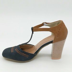 Womens T- Strap Ankle Strap High Heel Pump Cushioned Navy & Brown EUR 36 NEW