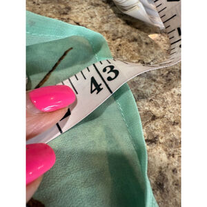 This is a pre-owned Torrid women's tunic top in a mint green color with a pink floral pattern. It features a V-neckline with a button-down front, long sleeves with roll-tab cuffs, and a gathered empire waist. The hemline is high-low, with the back being longer than the front. The fabric tag indicates it is 100% polyester, made in China, and the size tag shows "2". Measurements visible include approximately 43 inches for the back length and 22-23 inches across the chest. P4 313