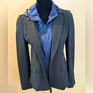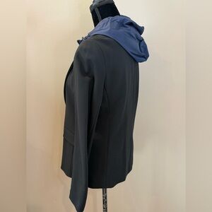 Women’s TORY SPORT Black blazer with navy windbreaker jacket insert- size medium. Removable navy windbreaker hood. One black button on blazer. Excellent condition- just dry cleaned. See all photos, including chest measurement. Smoke free home. Fast shipping!