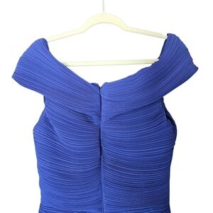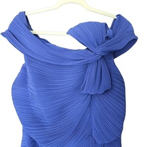 Women's Tadashi Shoji Blue Off-the-Shoulder Bow Gown Dress size 16. FLAW: There are a few pulls in the front below the waist as shown in last 2 pictures.