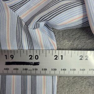 This Tahari blouse offers a tailored yet feminine touch with its blue striped pattern, button-down style, and ruffle cuffs. Crafted for comfort and style, it provides a polished look suitable for professional or casual settings.