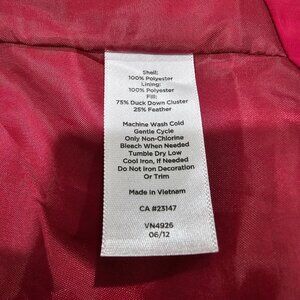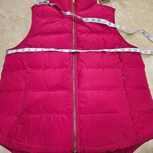 Women's Talbots Down/Feather Puffer Vest Cranberry Red Pockets Size M. Shell and Lining: 100% Polyester. Fill: 75% Duck Down Cluster and 25% Feather. Has 2 zipped front pockets. Laid flat measures approximately 20.5" armpit to armpit and 25" long from top of shoulder to bottom hem. No holes or stains. Smoke free home.