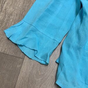 21” from top to bottom 13” armpit to end of sleeve 18.5” armpit to armpit. Light blue Button Up Linen blazer jacket. Size 8 petite. With front pockets.
