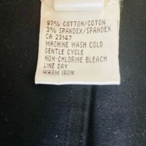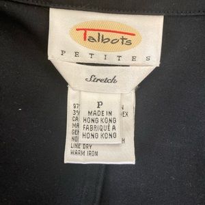Women's Talbots Petites Button Front Stretch Cropped Jacket in black. Size: Petite. Material: 97% Cotton 3% Spandex. There is no lining. This is a great jacket to wear over a basic tee or sweater. Has a bit of stretch as well.
