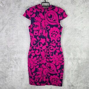This tailored sheath dress combines striking pink and navy floral patterns with a fitted silhouette, offering a polished look for professional settings.