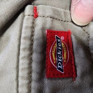 Stylish and versatile tan cargo pants. Perfect for casual outings and everyday wear. Dickies brand relaxed fit cargo pants. there are no tags inside that indicate the size. they're mid rise bootcut. no stretch. the flat lay measurements are: w18 i32 r9.5 leg opening 9 total length 41 #34