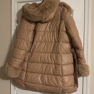 Stay warm and stylish with this tan puffer coat featuring luxurious faux fur trim. Perfect for chilly days.