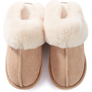Women's Tan Fluffy Cozy Winter Warm Memory Foam Slip On Slippers Shoes