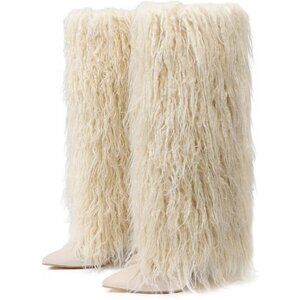 ⚡Women's Tan Fur Fluffy Knee High Boots Heels Wide Calf Fold Over Tall Boots