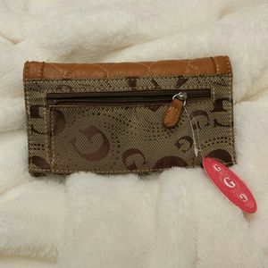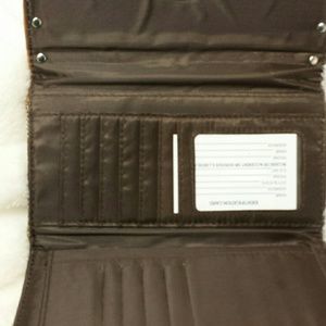 Trifold Womens Wallet with zip pocket on the outside with a check book cover and credit card slots.