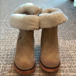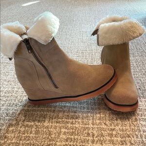 Step out in style with these chic tan leather wedge boots. Featuring a cozy genuine shearling fur lining, these boots are perfect for adding a touch of elegance to your winter wardrobe. They have zippers on both sides to show the shearling lining or not. Only worn a couple of times.