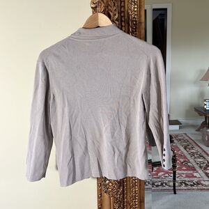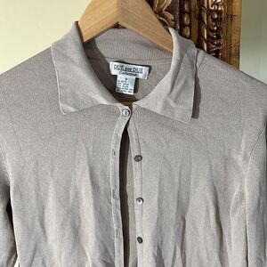 Women's stone / tan button up cardigan, dress top with shell buttons, cute mini collar. Perfect sweater for over a dress, or can layer with jeans. Could dress up or dress down making this button up tan sweater perfect for any capsule wardrobe, very versatile. True Vintage, Brand Due per Due Collection.
