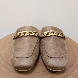 These tan mules from Corkys have a soft faux leather upper and a slip-on design. They feature a gold chain detail across the top and a cushioned insole for all-day comfort.
